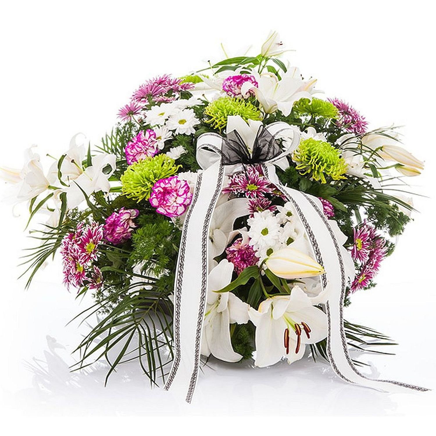 | Velká | Vypichované aranžmá, 8ks chrysantéma, 3ks královská lilie, 4ks jednokvětá chrysantéma, 4ks karafiát, florexová hmota,dekorativní zeleň (italský ruscus, robelini, chvojí) a smuteční stuha |