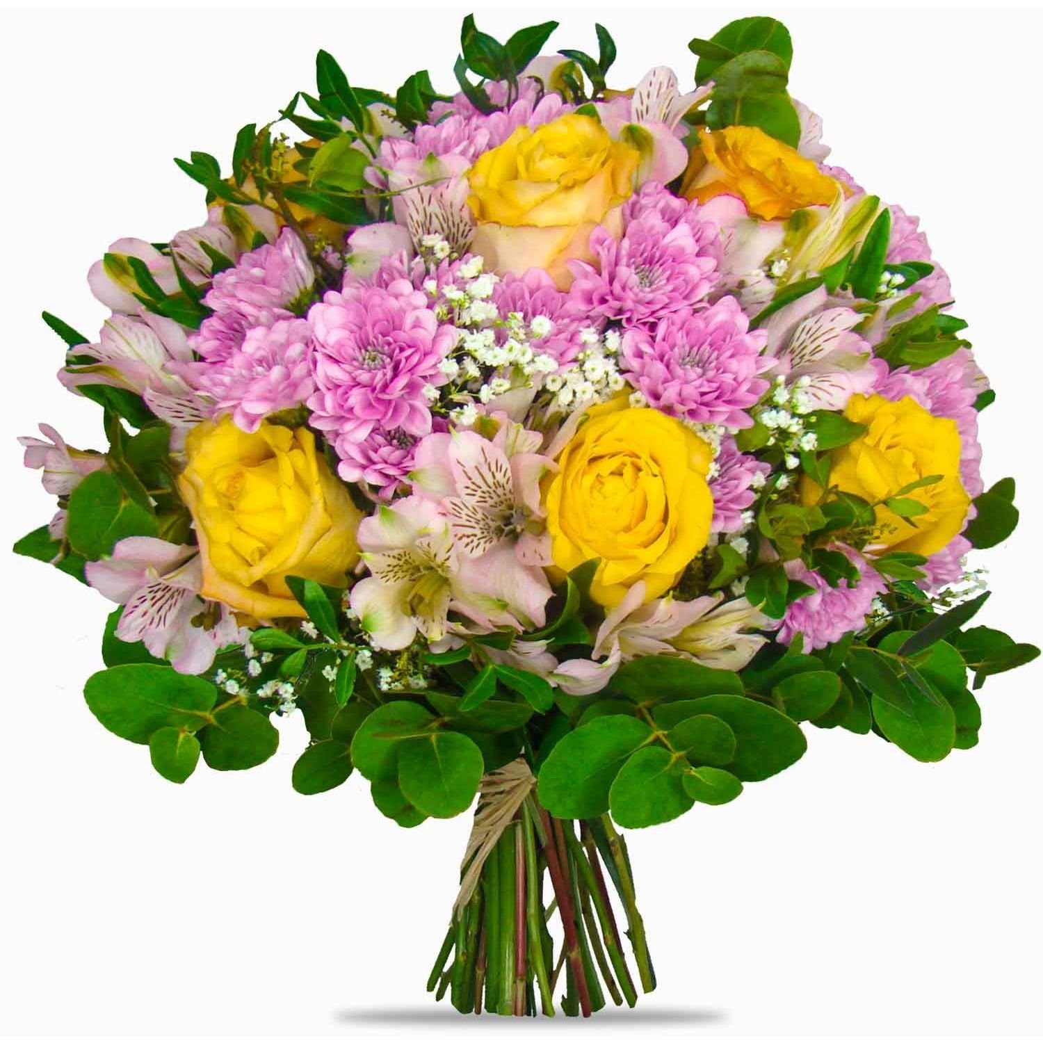 Tato elegantní kytice na první pohled zaujme jemným spojením žlutých růží, světlých alstroemerií a růžových chryzantém, které spolu ladí v nádherné harmonii barev i tvarů. Křehké lístky gypsophily a svěží zeleň podtrhují celkový dojem lehkosti a radosti, který kytice vytváří. Ideální je jako milé překvapení k narozeninám, poděkování či zpříjemnění každodenních chvil. Klademe důraz na profesionální vázání květin a vždy dbáme na precizní formu předání. Doručujeme v den objednávky během pracovních dnů a nabízíme možnost volby přesného času doručení. O doručení vás navíc informujeme e-mailem, takže máte jistotu, že vaše přání dorazí včas.