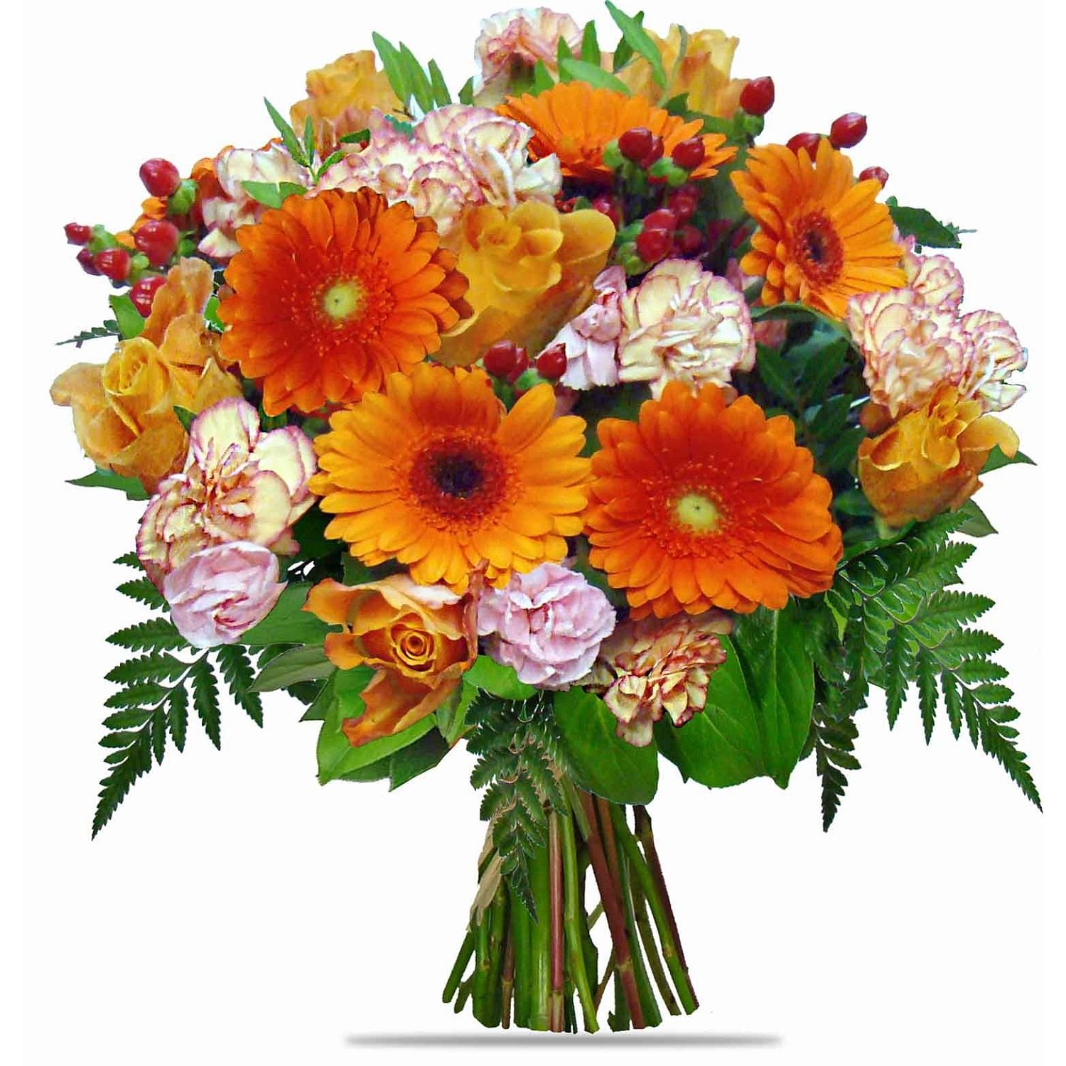 Naše kytice přináší harmonii teplých oranžových a jemně růžových tónů, které dokonale spojuje spojení růží, mini gerber a karafiátů. Vše je elegantně doplněno drobnými plody hyperica a decentním zeleným listím, které celkovému vzhledu dodává svěžest a přirozený šarm. Tato elegantní kombinace je ideální pro slavnostní chvíle, přání k narozeninám nebo zpestření běžného dne. Doručujeme v den objednávky během pracovních dnů a rádi vám nabídneme možnost stanovit přesný čas doručení dle vašich potřeb. Naši zkušení floristé dbají na každý detail, díky čemuž jsou květiny vždy profesionálně uvázané a vypadají přesně tak, jak si přejete.