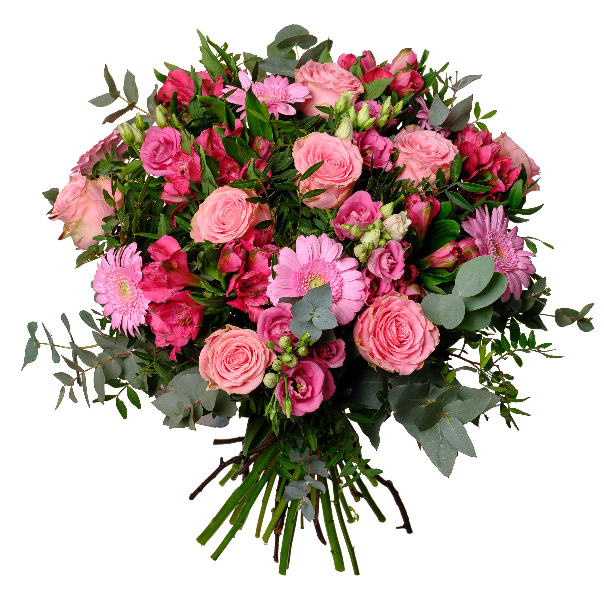| Standardní | 3 ks růží, 2 ks eustoma, 4 ks alstromerie, 3 ks germína a dekorativní zeleň (pistacie, eukalyptus) |