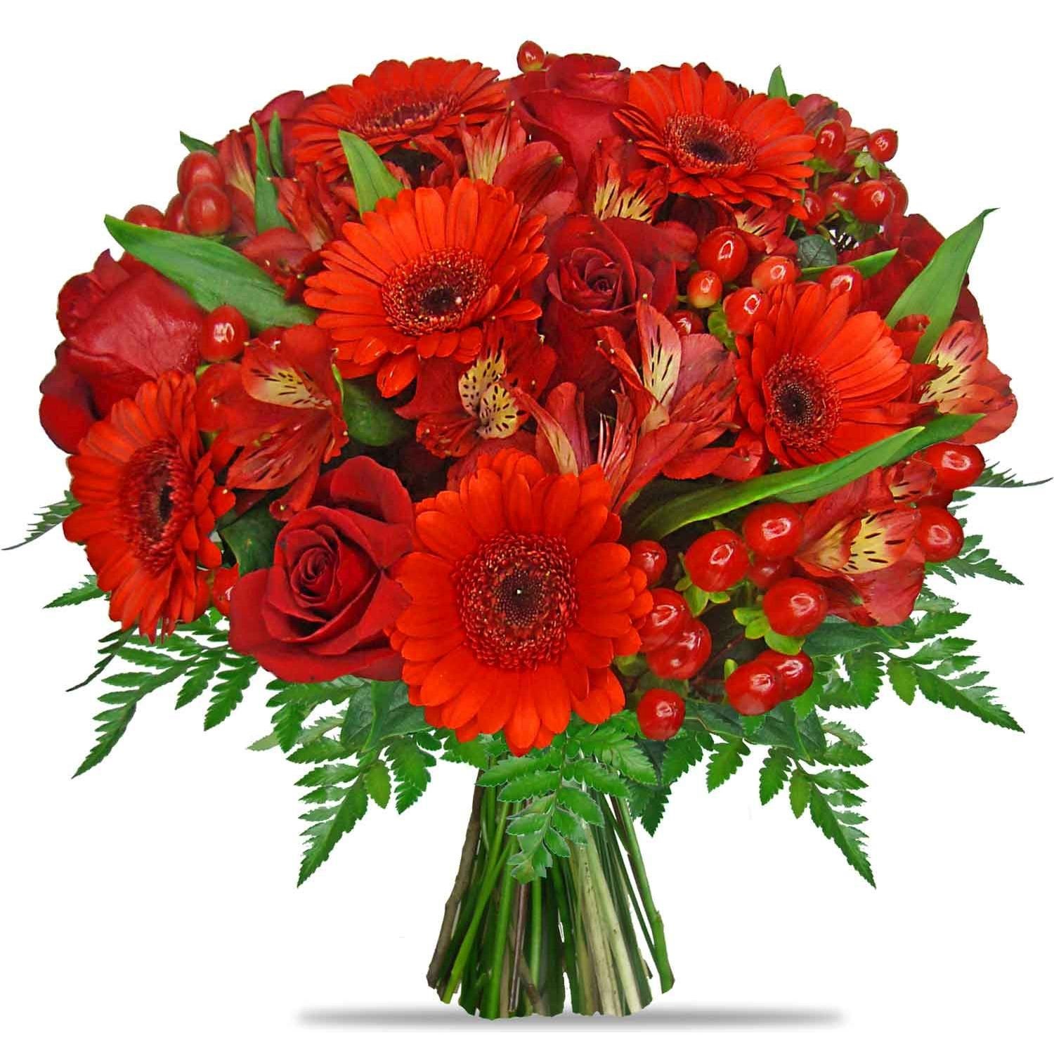 Naše kytice vyniká energickou kombinací žáru červených růží, germinek, alstromerií a bobulek hyperica, které společně vytvářejí harmonický a živý celek. Elegantní tvar doplňuje decentní okrasná zeleň a podtrhuje jedinečný dojem celé vazby. Tato aranžmá je perfektní volbou pro slavnostní příležitosti, poděkování i vyjádření radosti svým blízkým. Rádi doručíme ještě dnes během pracovních dnů a nabízíme možnost volby přesného času doručení podle vašich přání. Všechny květiny vážou naši zkušení floristé s maximální pečlivostí, a samozřejmostí je pro vás potvrzení o doručení e-mailem.