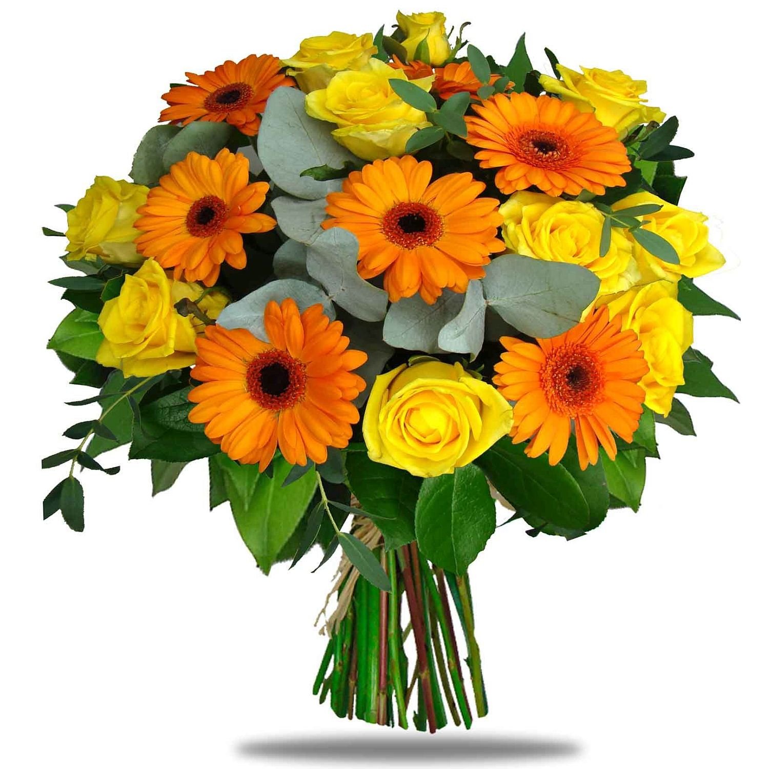 Tato kytice spojuje teplé odstíny žlutých růží a zářivě oranžových germínek, které krásně doplňuje eukalyptus a svěží zeleň. Vzniká tak příjemně energická a pozitivní kombinace květin, která rozzáří každý interiér a navodí veselou, přátelskou atmosféru. Kytici oceníte při oslavách významných životních událostí, jako je narozeninové nebo gratulační překvapení, i jako stylové poděkování. Doručení zajišťujeme v den objednávky během pracovních dnů a nabízíme možnost výběru přesného času doručení. S námi máte jistotu spolehlivého doručení, o kterém vás informujeme e-mailem. O vaši kytici se vždy starají naši zkušení floristé.