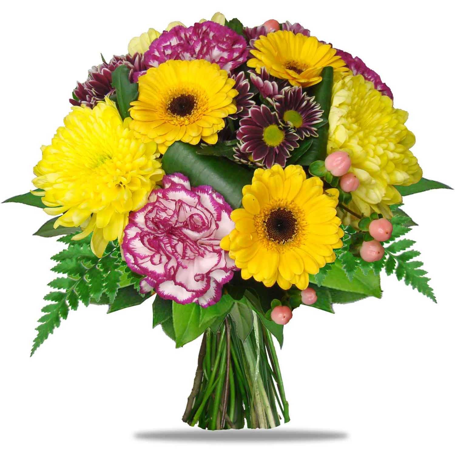 | Standardní | 3 ks jednokvětá chrysanthéma, 3 ks germína, 2 ks kafafiát, 2 ks chrysanthéma santini, 1 ks hypericum a dekorativní zeleň |