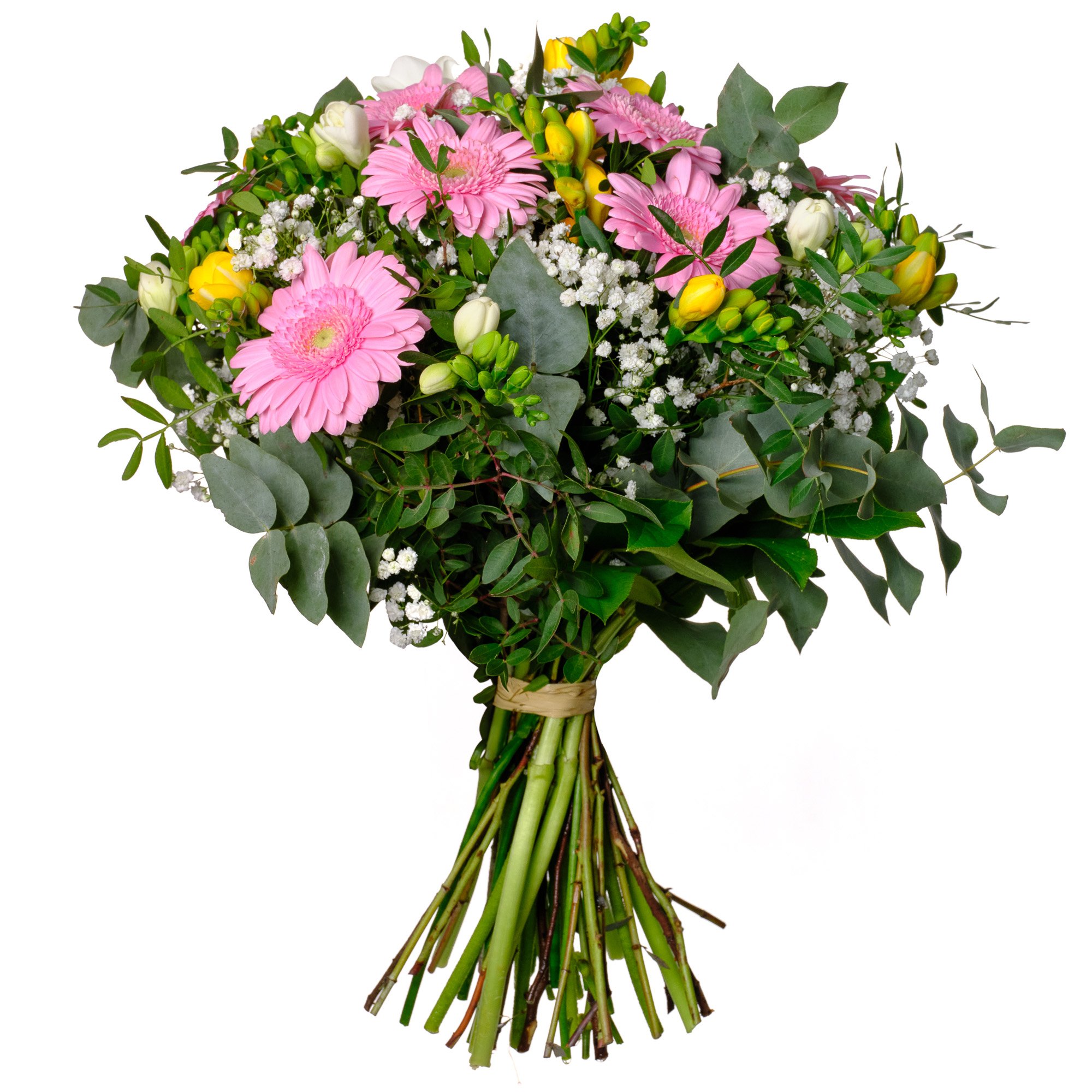 | Exkluzivní | 9 ks růžová mini gerbera, 6 ks bílá frézie, 6 ks žlutá frézie, 4 ks gypsophila a dekorativní sezónní zeleň (pistacie, eukalyptus, salal) |