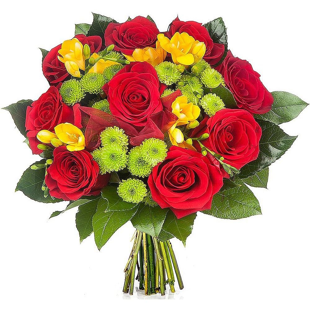 Naše elegantní kytice v sobě spojuje něžné červené růže s veselými žlutými fréziemi a svěžími zelenými chryzantémami santini. Harmonická kombinace těchto květin působí slavnostně, energicky a zaručeně rozzáří každý interiér. Celkový dojem je podtržen svěží zelení, která dodává aranžmá moderní, živý nádech. Tato kytice je skvělou volbou pro narozeniny, poděkování, gratulaci i jen tak pro potěšení blízkých. Doručujeme v den objednávky během pracovních dnů, můžete si zvolit i přesný čas doručení a na jistotu obdržíte potvrzení o doručení e-mailem. O vše se postarají naši zkušení floristé, kteří každou kytici vážou s maximální pečlivostí.