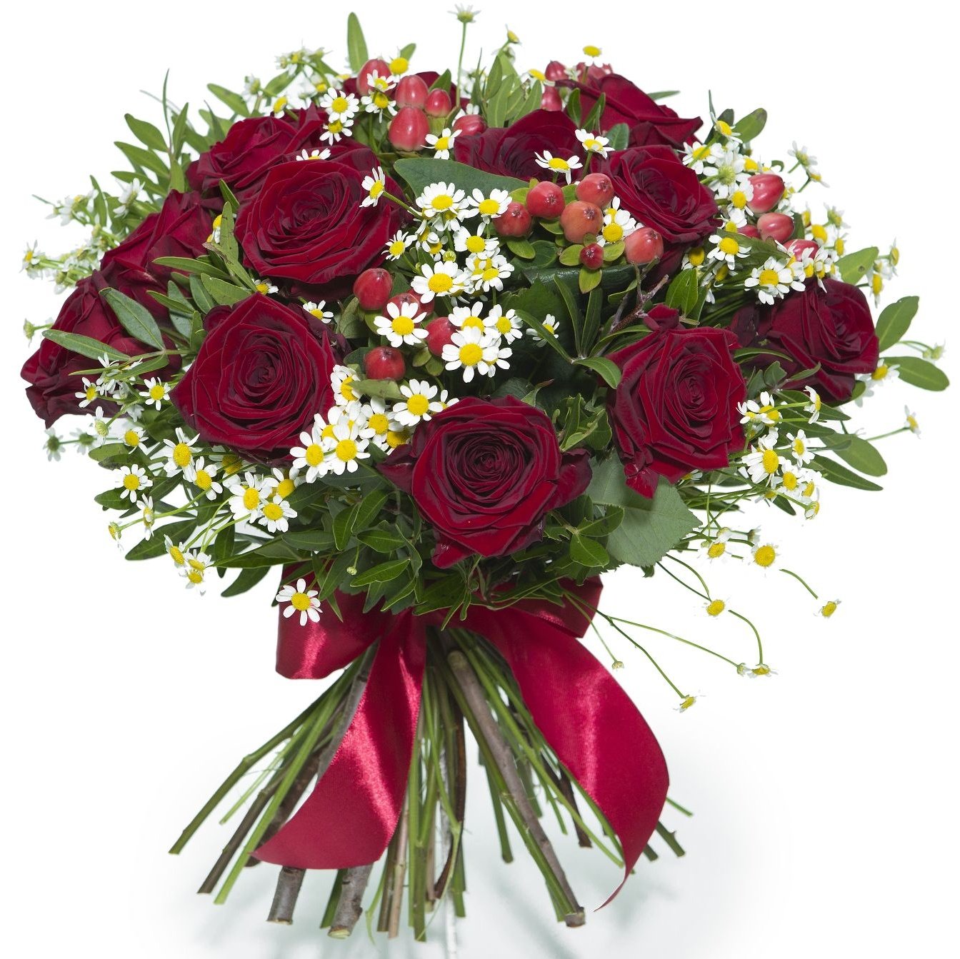Naše elegantní kytice kombinuje bohaté červené růže, jemné bílé heřmánky a klasické hypericum, které vytvářejí harmonickou a působivou kompozici. Jednotlivé květiny se dokonale doplňují a spolu s dekorativní zelení a výraznou stuhou působí velmi slavnostně a svěže. Tato kytice je ideální volbou pro oslavy výročí, narozeniny nebo jako krásné překvapení pro někoho výjimečného. Doručujeme již v den objednávky během pracovních dnů a nabízíme možnost objednat přesný čas doručení. Naše květiny jsou vždy profesionálně uvázané našimi zkušenými floristy a po doručení vám zašleme potvrzení e-mailem.
