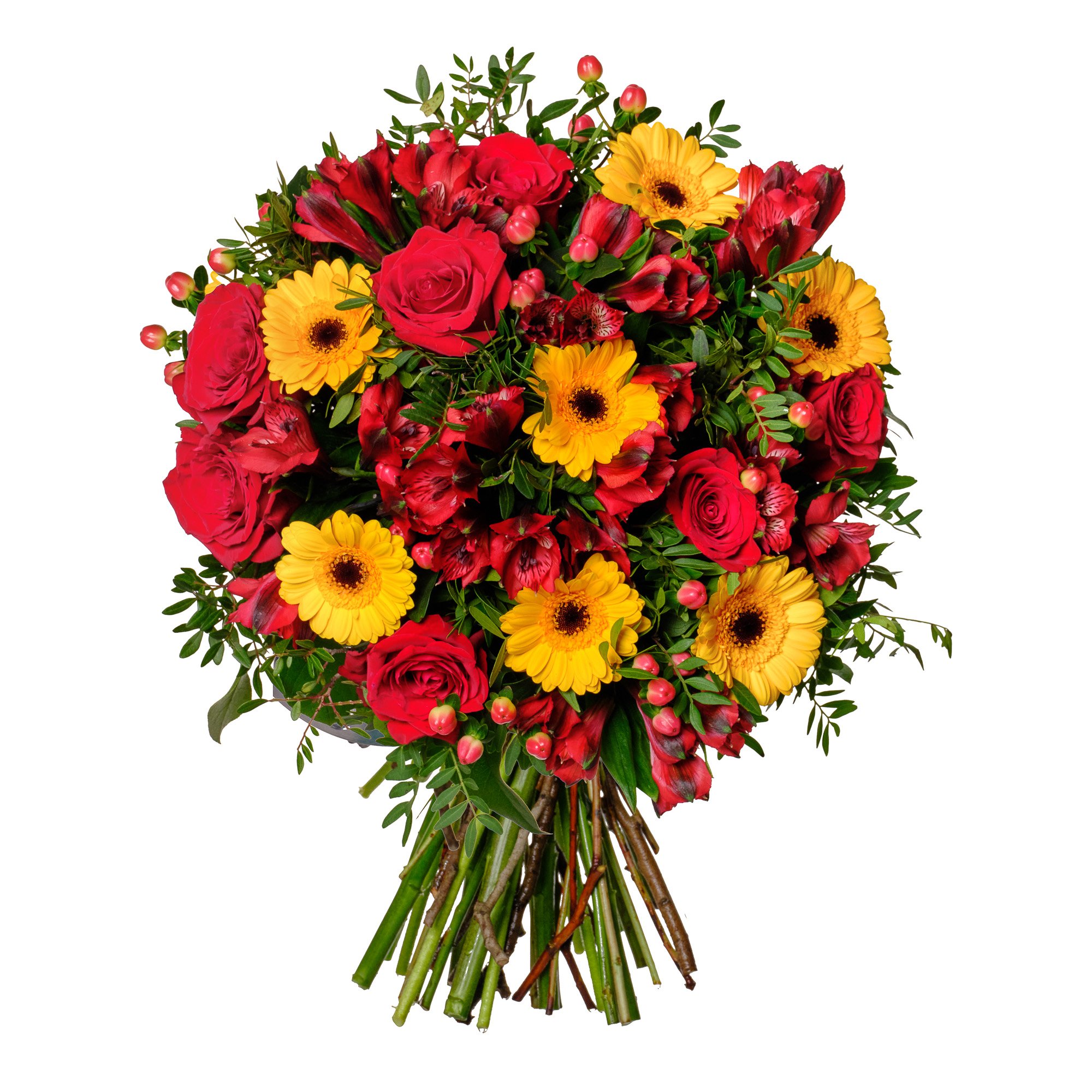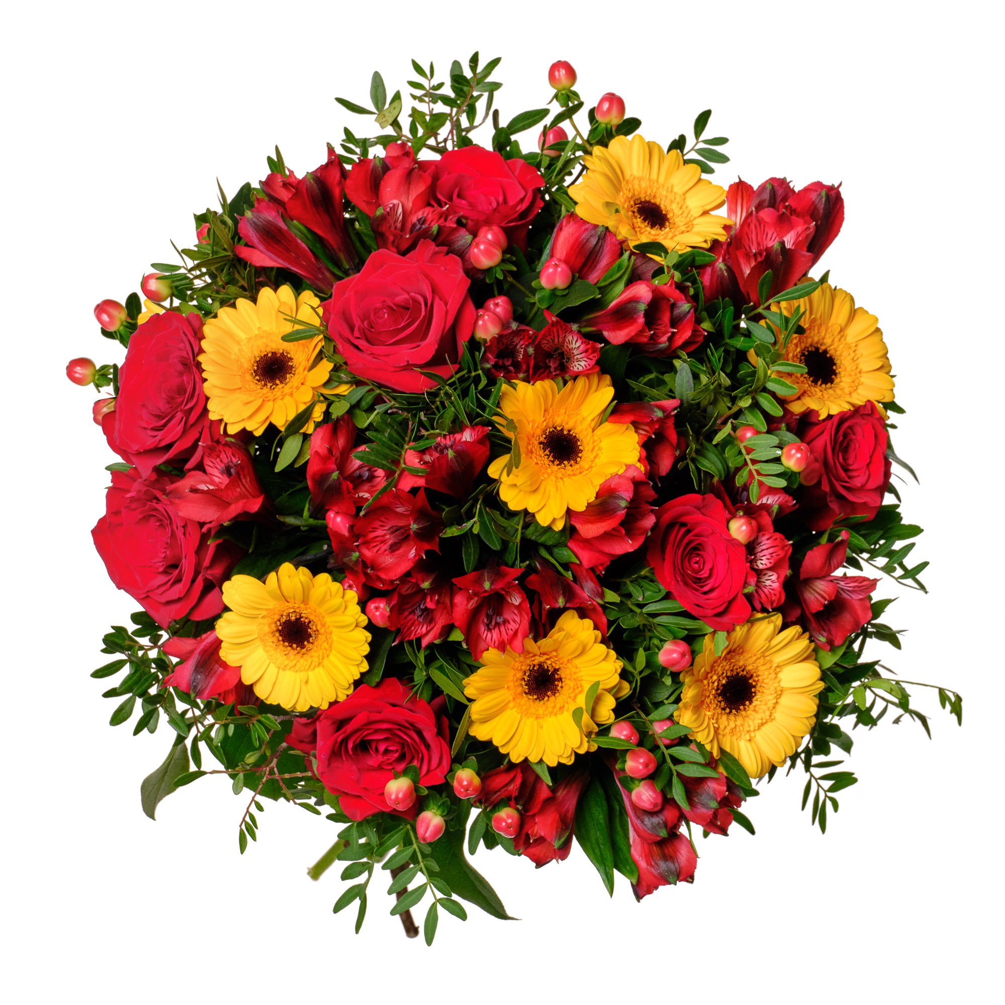 Tato pestrá kytice propojuje sytě červené růže s veselými žlutými gerberami mini, jejichž zářivé odstíny jsou umocněny elegantními alstromeriemi a drobnými plody hyperica. Kombinace těchto květin vytváří svěží a energickou atmosféru, která rozjasní každý den a potěší při jakékoli příležitosti – od narozenin po poděkování. Decentní zeleň pouze doplňuje celkové aranžmá a nechává vyniknout přirozenou krásu jednotlivých květů. Naši zkušení floristé dbají na precizní uvázání a harmonii barev. Kytici doručujeme v den objednávky během pracovních dnů a rádi pro vás zajistíme doručení ve vámi zvoleném čase s jistotou potvrzení o převzetí e-mailem.