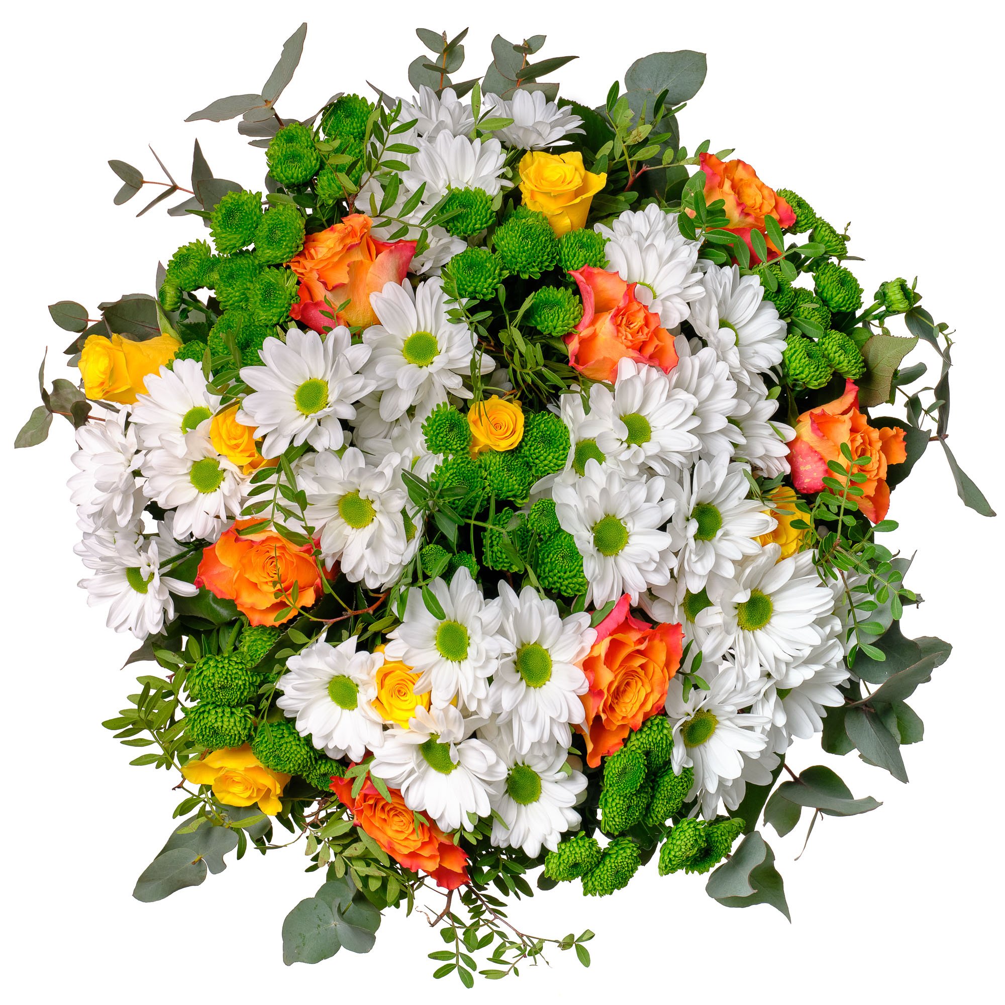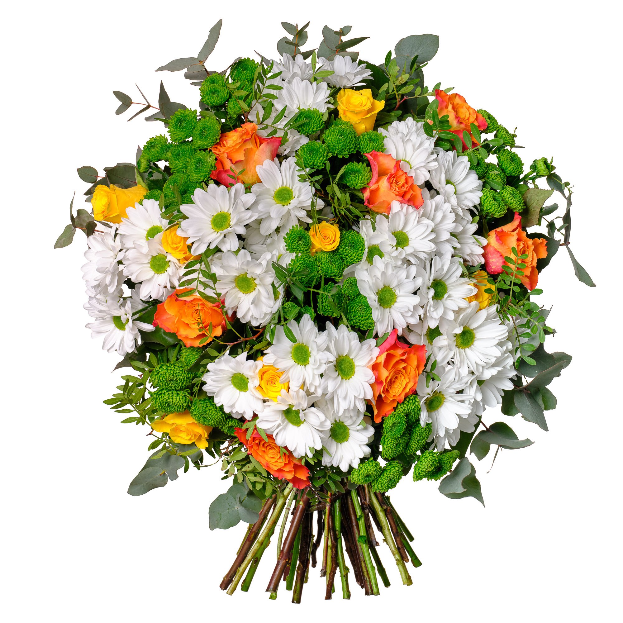 Naše květinová vazba v sobě dokonale spojuje živost oranžových růží, svěžest bílých chryzantém a veselost zelených santini. Kombinace jemného zeleného eukalyptu a pistácie tvoří decentní, ale výrazný základ, který celou kytici přirozeně podtrhuje. Výsledkem je energická a optimistická atmosféra, která se výborně hodí například k narozeninám, poděkování nebo jen tak pro radost. Kytici vždy vážeme s maximální pečlivostí a vstřícností, protože na každém detailu nám záleží. Doručujeme v den objednávky během pracovních dnů s možností výběru přesného času doručení. O předání Vás informujeme e-mailem.
