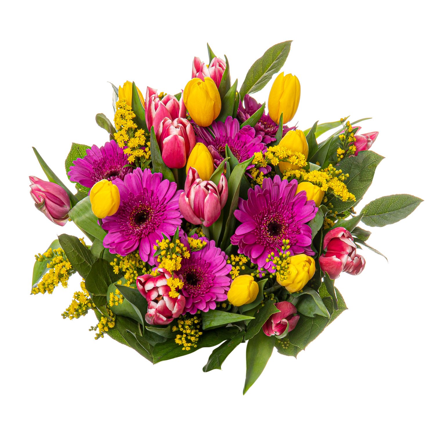 | Standardní | 5 ks gerbera mini, 5 ks tulipán žlutý, 5 ks tulipán růžový, 3 ks solidago, dekorativní zeleň (salal) |