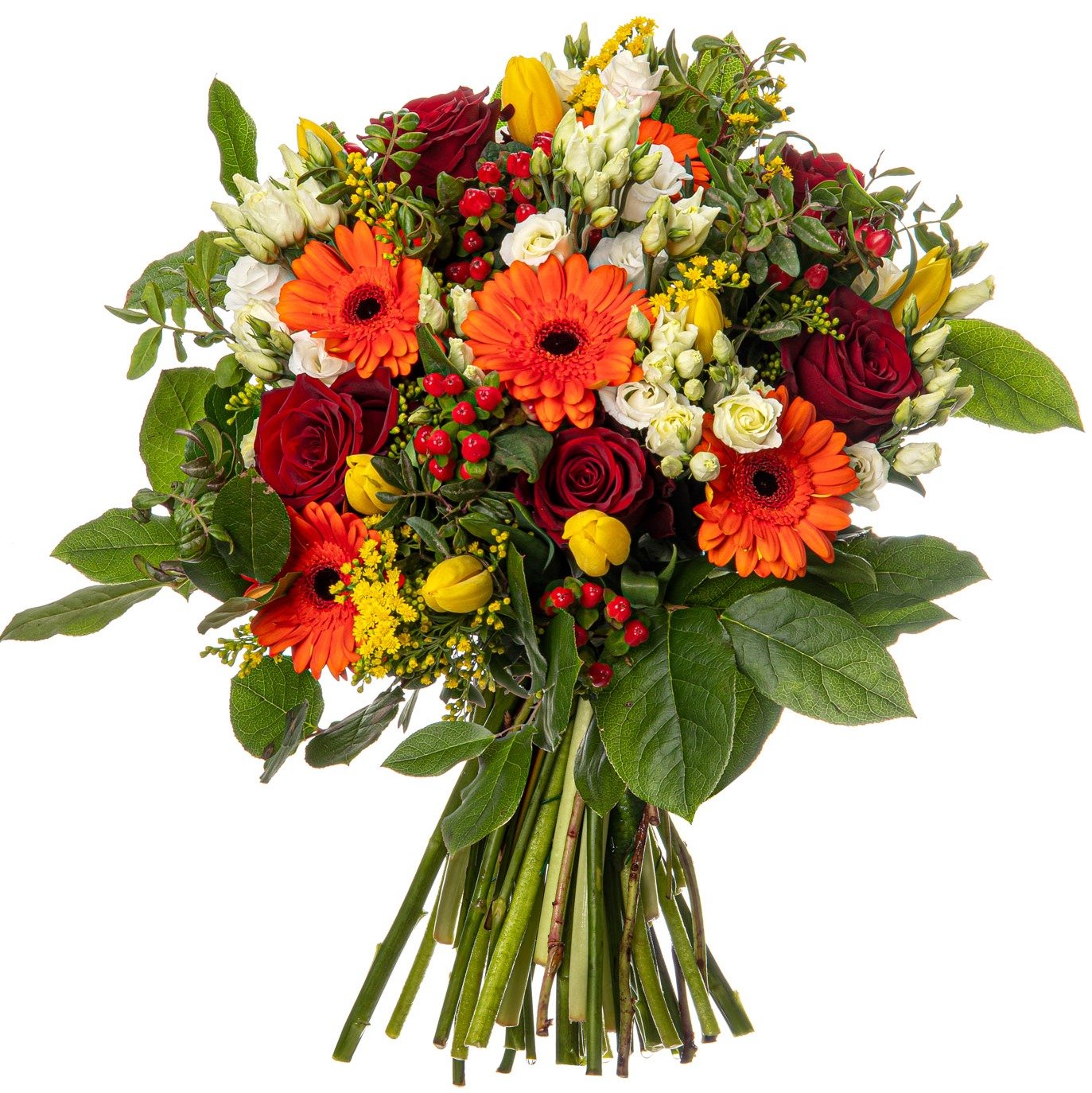 Tato kytice vyniká nádherným propojením zářivých barev, které spolu dokonale ladí a navozují radostnou atmosféru. Červené růže v kombinaci s oranžovými gerberami a žlutými tulipány vytvářejí výrazný a optimistický kontrast, který rozjasní každý interiér. Jemné květy eustomy spolu s hypericem a zelenými doplňky podtrhují celkovou svěžest. Tato kytice je perfektní volbou pro slavnostní události, narozeniny, poděkování nebo jen pro zpříjemnění běžného dne. Doručujeme v den objednávky během pracovních dnů, nabízíme možnost zvolit si přesný čas doručení a potvrzení obdržíte e-mailem. Naši zkušení floristé zaručují profesionálně uvázané květiny i vstřícný přístup.