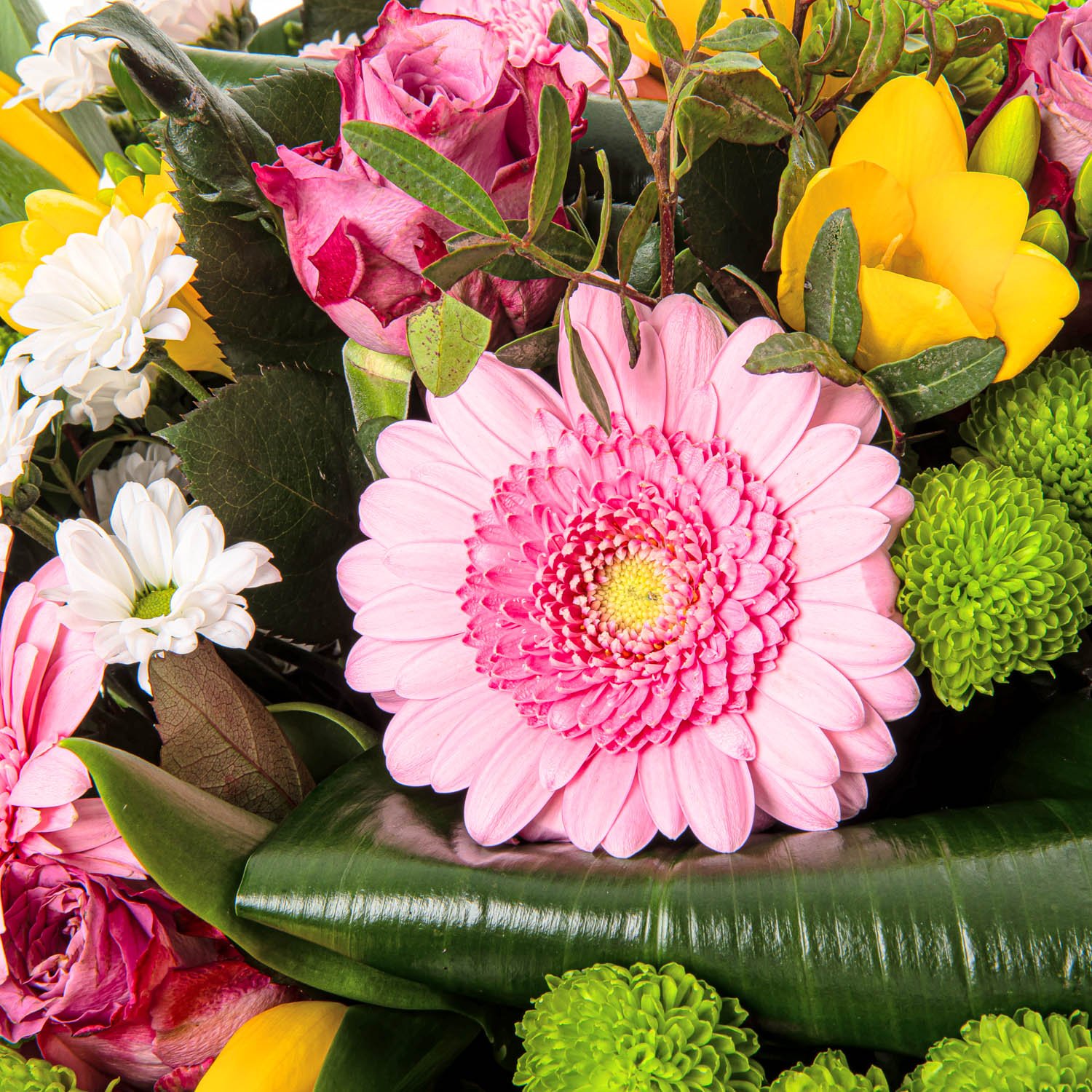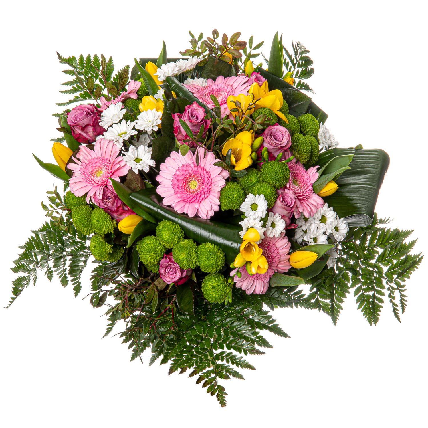 Tato kytice působí svěže, hravě a optimisticky. Růžové růže a gerbery harmonicky doplňují žluté tulipány a frésie, které kytici propůjčují zářivé akcenty. Bílé a zelené santini přidávají kompozici lehkost a přírodní nádech, zatímco dekorativní zeleň vše spojuje do krásného celku. Tento aranžmán je ideální volbou pro narozeniny, přání k uzdravení i jako pozornost z lásky. Rádi kytici doručíme v den objednávky během pracovních dnů a nabízíme možnost objednat přesný čas doručení. Váš zážitek navíc podpoříme profesionálně uvázanými květinami a jistotou doručení potvrzenou e-mailem.