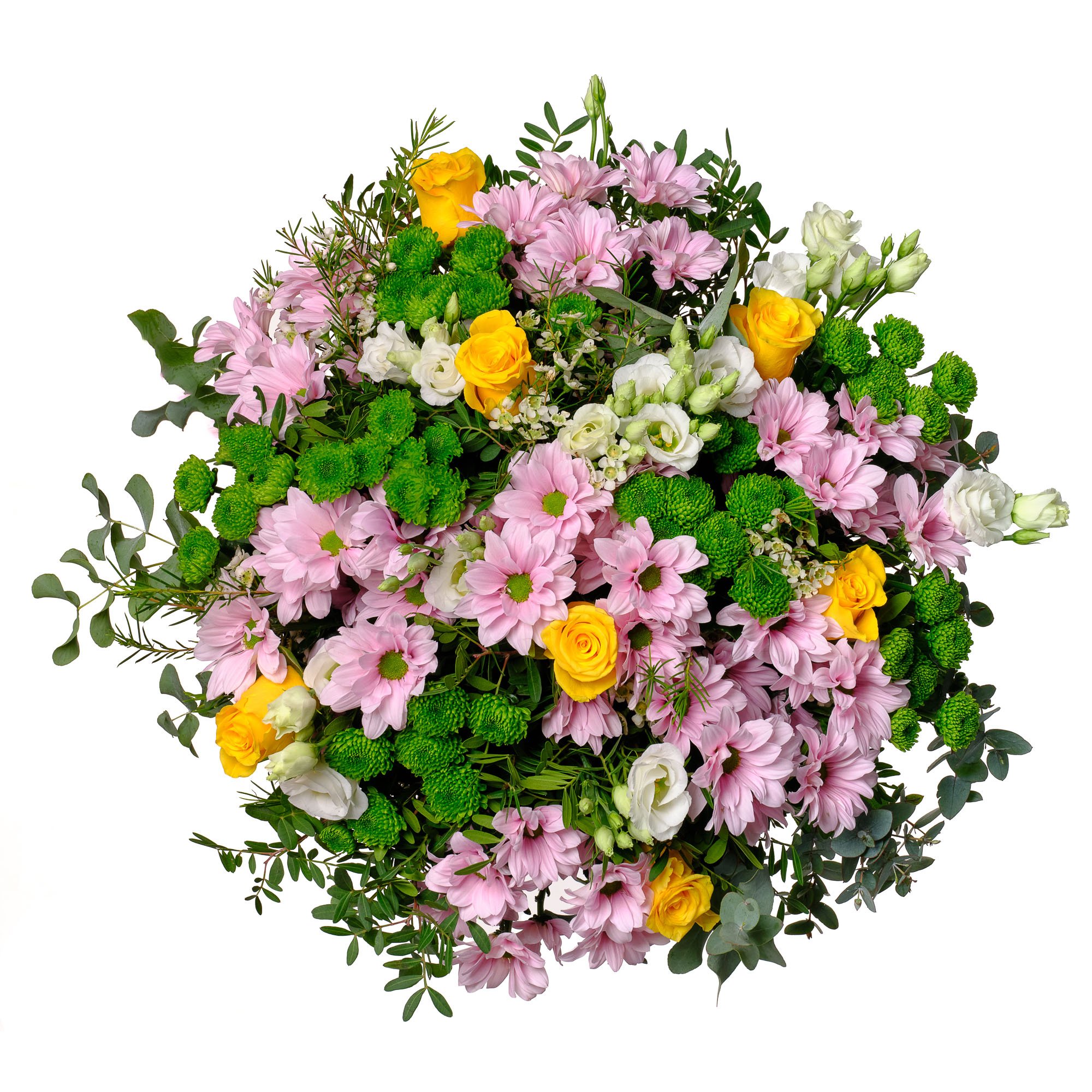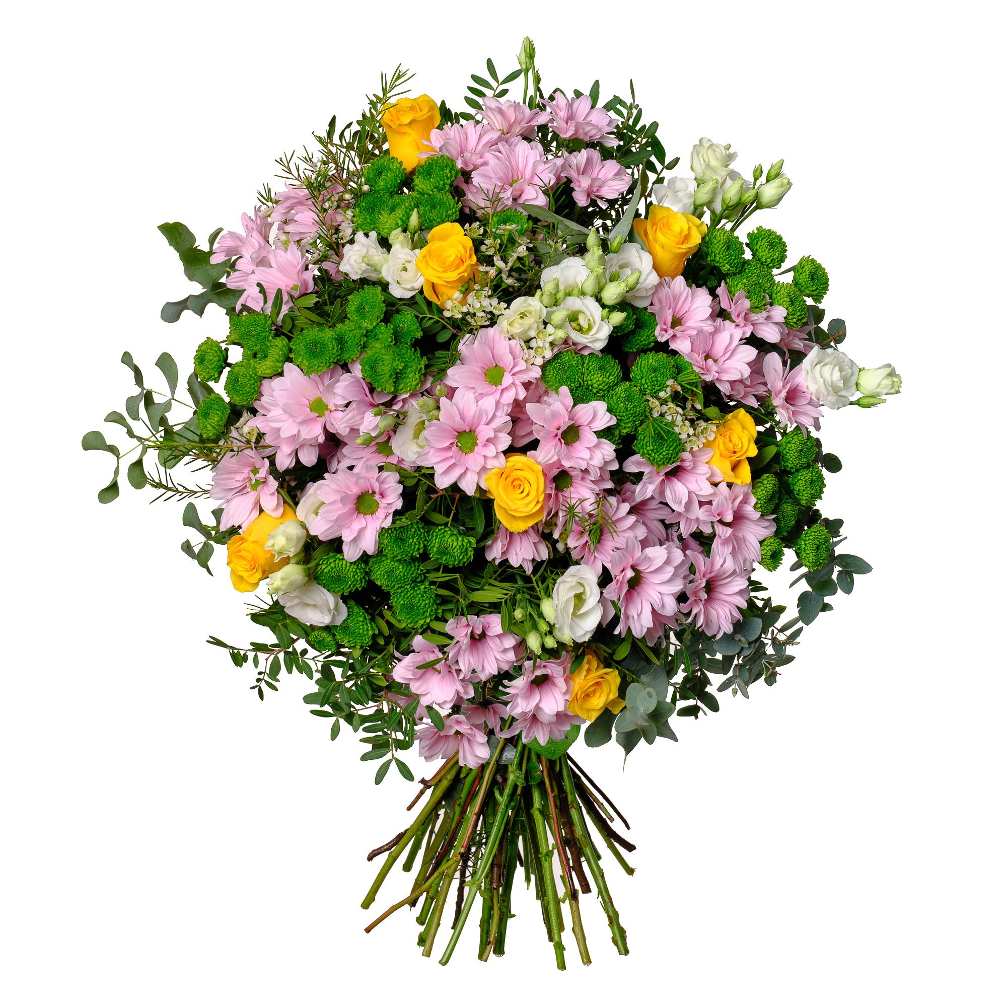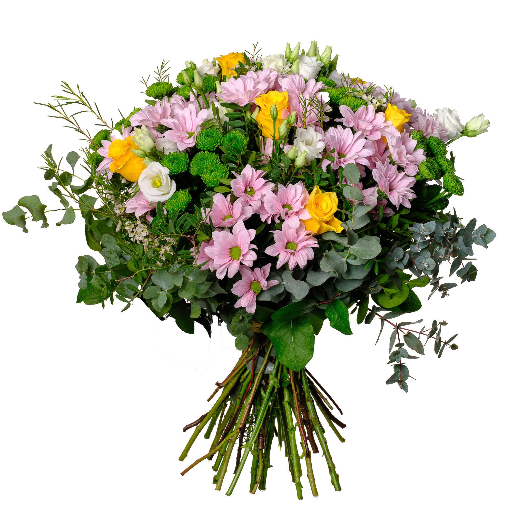 Naše elegantní kytice v sobě spojuje jemné růžové chryzantémy, zářivé žluté růže, svěží zelené santini a křehké eustomy. Svěží zelené tóny doplňuje nenápadná eukalyptová zeleň, která celkový dojem krásně zdůrazňuje. Tato kytice působí svěže a radostně – je tak ideální volbou pro narozeniny, poděkování i všední chvíle, kdy chceme někomu vyjádřit radost nebo vděk. Naši zkušení floristé dbají na pečlivé a profesionální uvázání každé kytice, abyste vždy mohli počítat s perfektním výsledkem. Objednat lze doručení ve stejný den během pracovních dnů, s možností přesného času předání a potvrzením o doručení e-mailem.