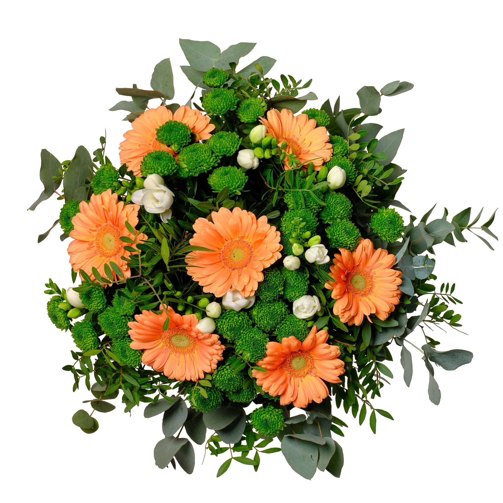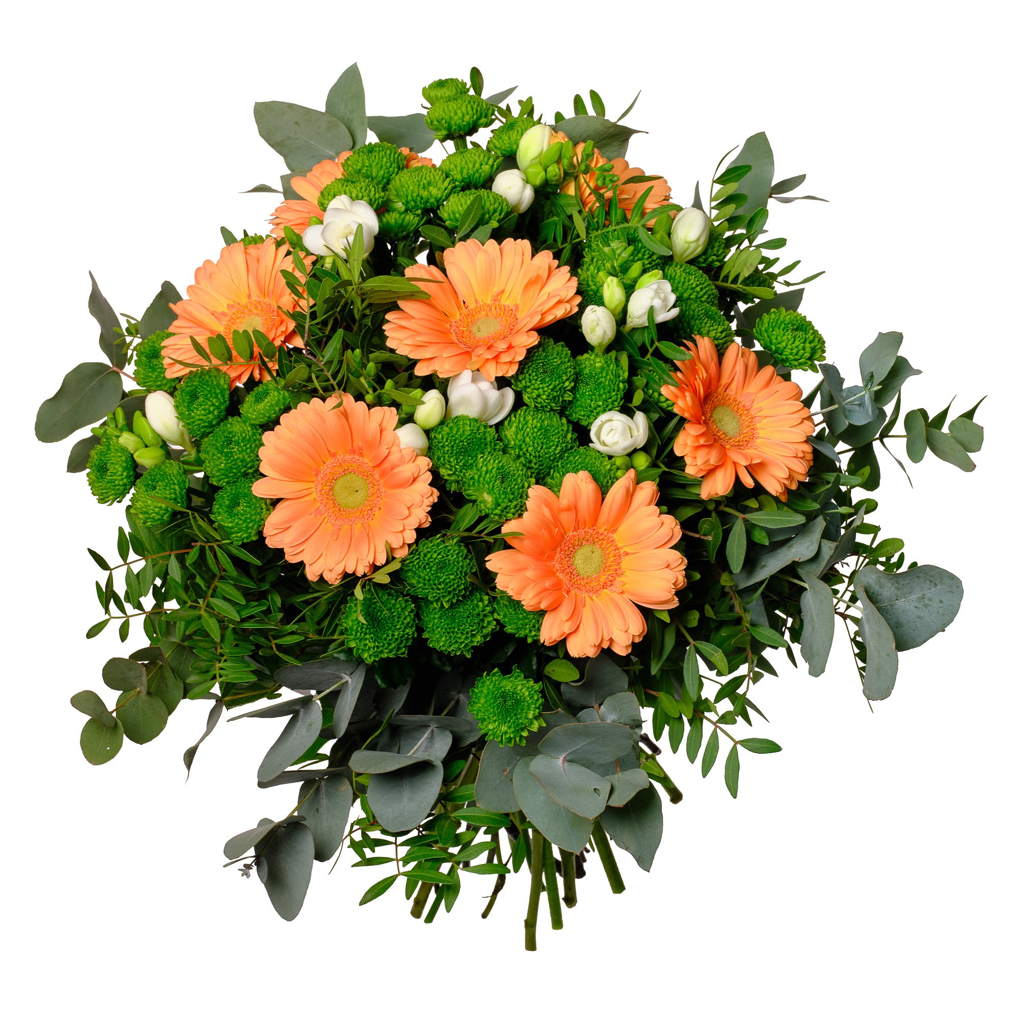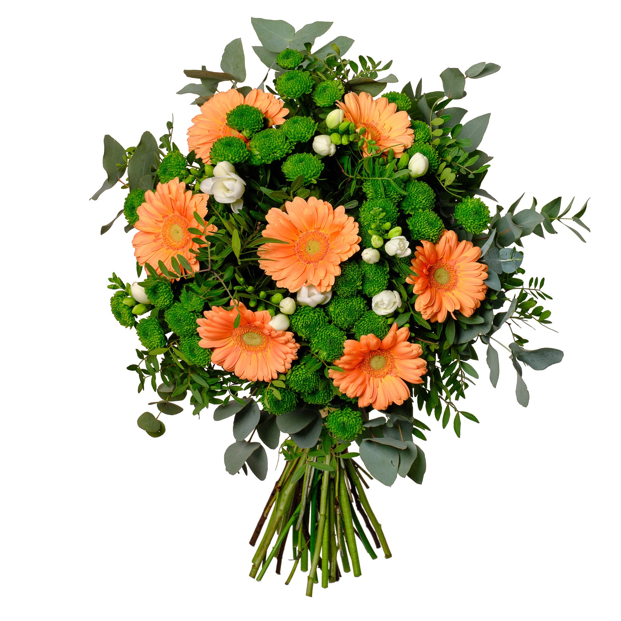 Něžně laděná kytice, která v sobě spojuje svěží oranžové gerbery, bílé frézie a zelené santini, vytváří svěží a veselou atmosféru. Každý detail podtrhuje jemná dekorativní zeleň, jež dodává celé kompozici harmonický přírodní vzhled. Toto aranžmá se hodí k oslavě narozenin, poděkování i k vyjádření radosti z běžného dne. S jistotou doručení a možností objednat přesný čas doručení můžete mít naprostý klid – vždy Vám zašleme e-mail s potvrzením. Naši zkušení floristé vážou kytice profesionálně a s citem pro detail, aby udělaly radost opravdu každému.