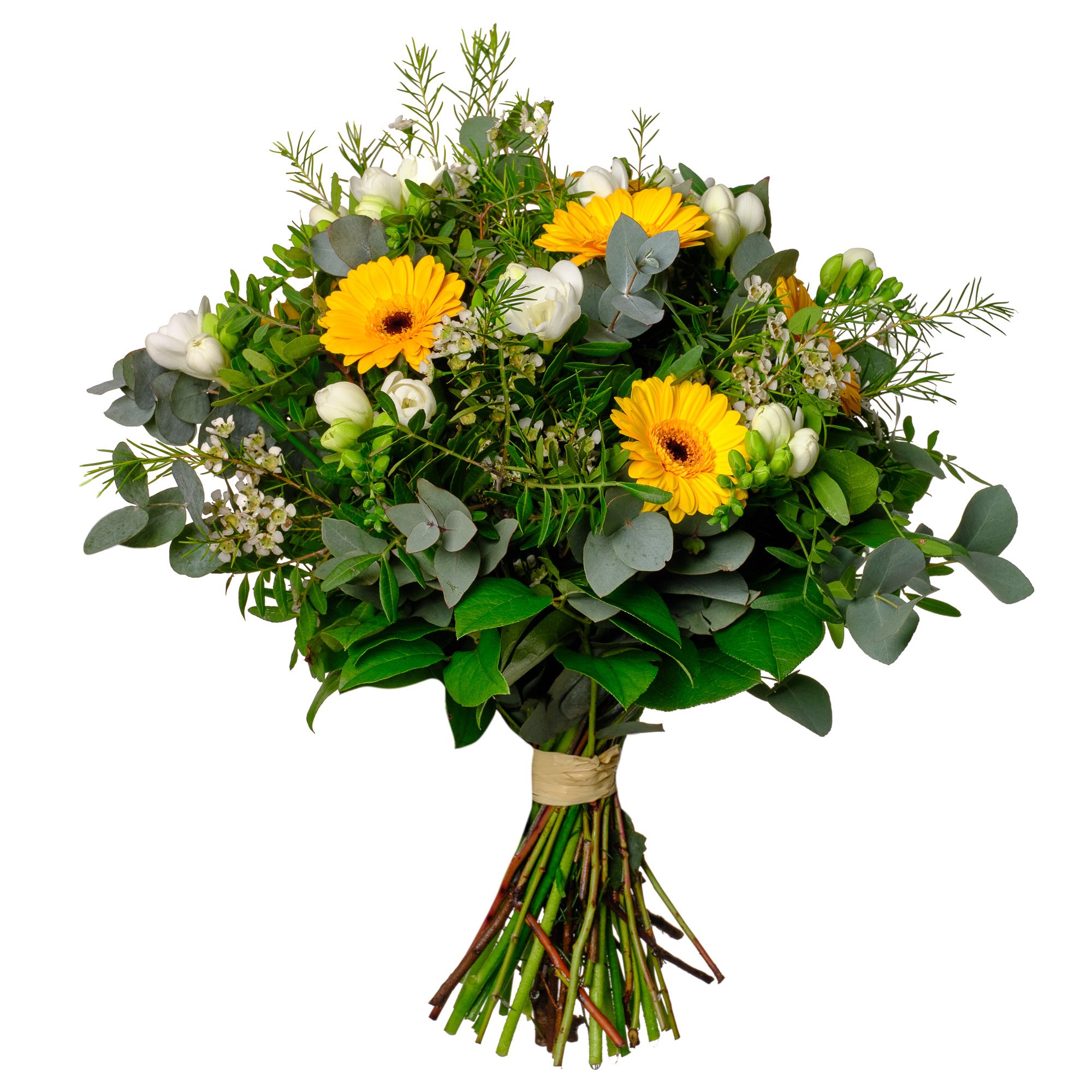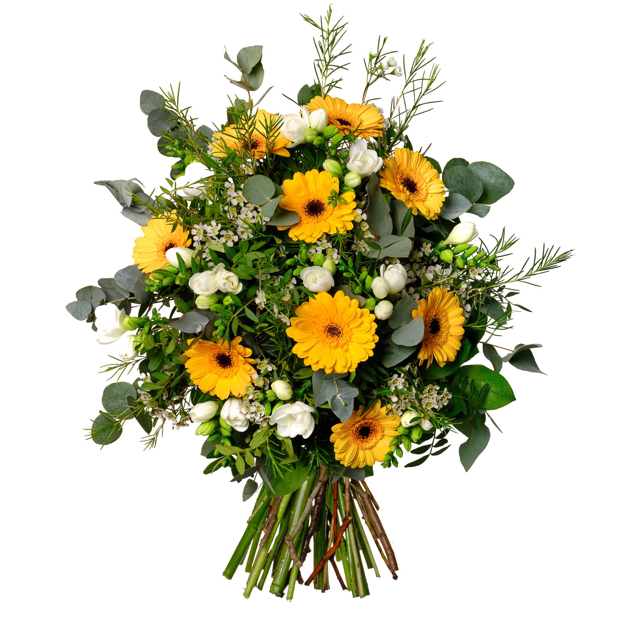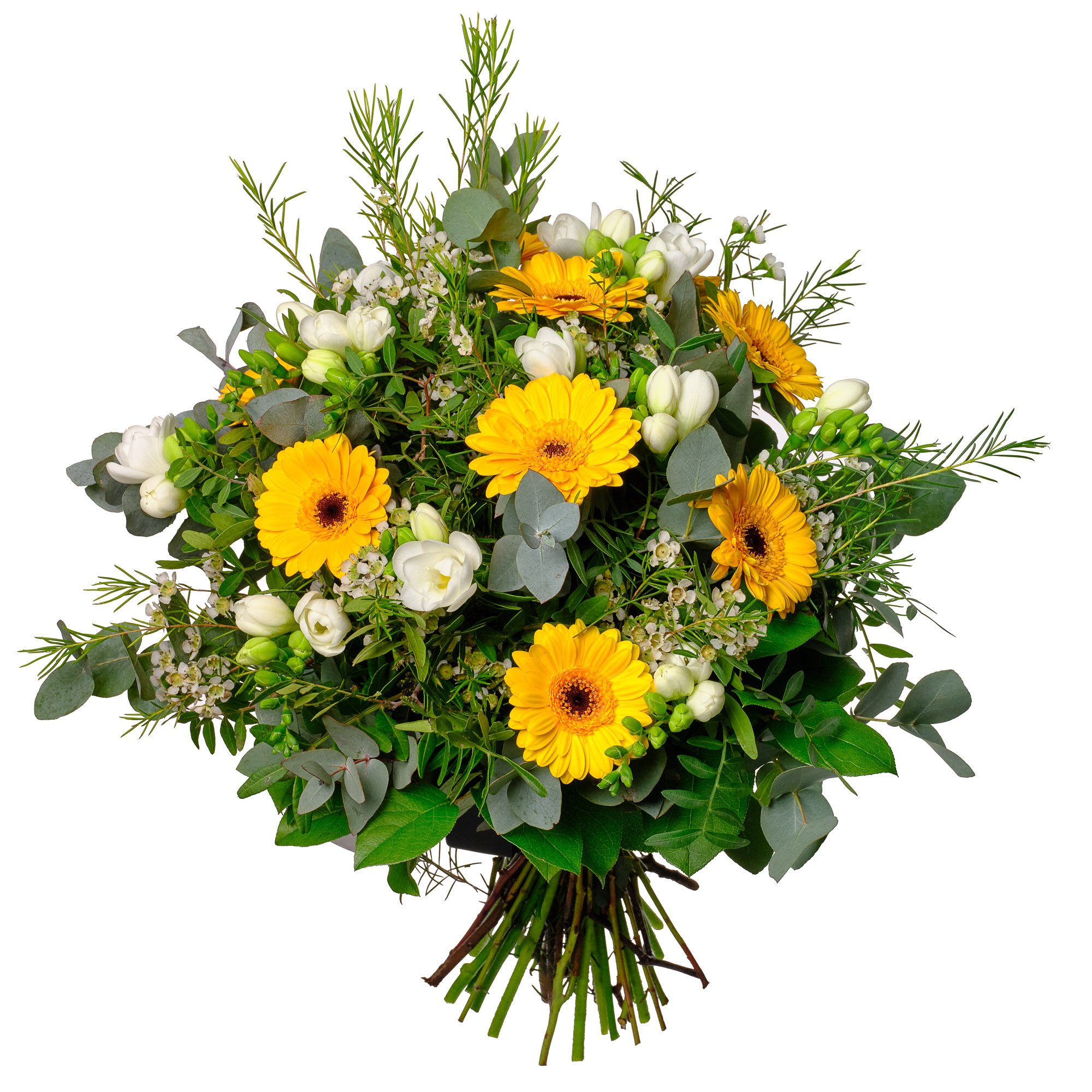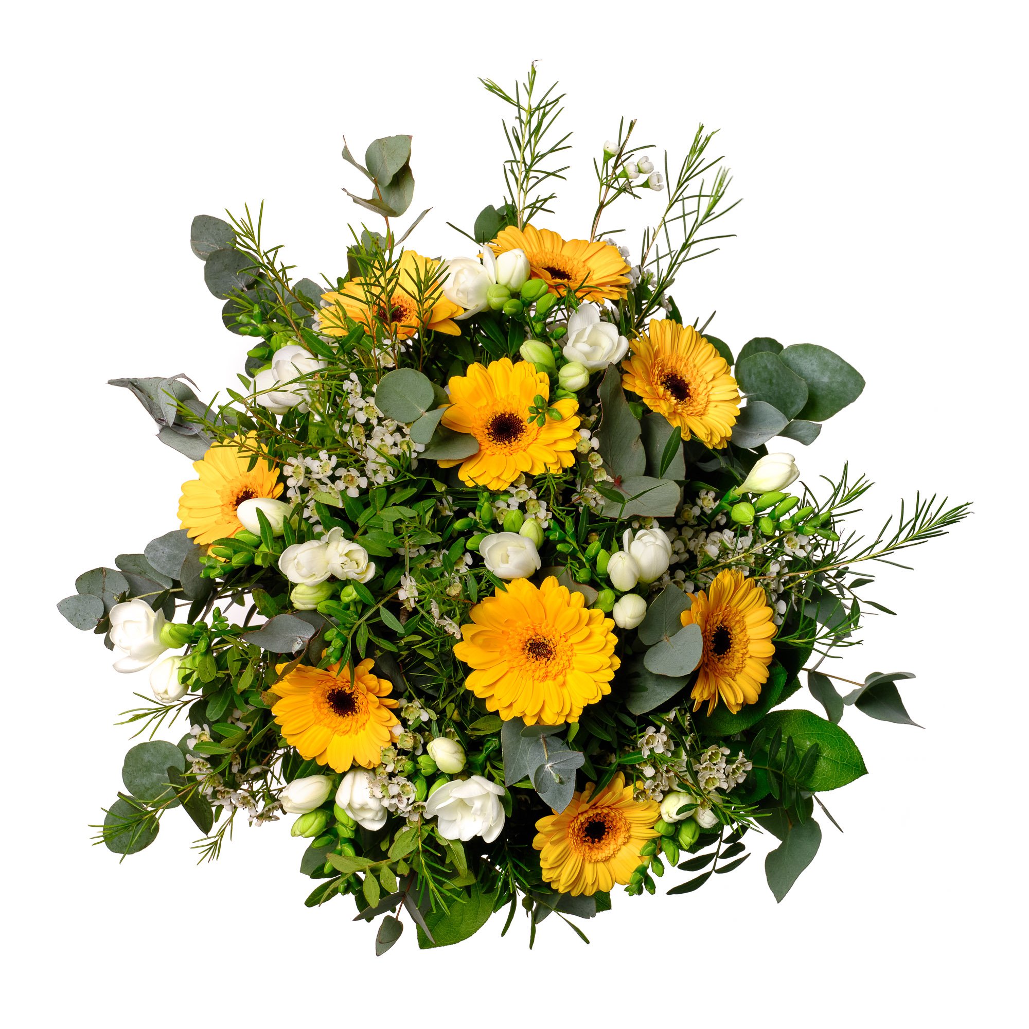 Kytice září jasnými odstíny žlutých gerber mini, jemnými bílými fréziemi a drobnými kvítky waxflower, které spolu vytvářejí optimistickou, přátelskou atmosféru. Harmonické propojení svěžích květin s dekorativní zelení eukalyptu a listy salalu působí přirozeně a svěže. Tato kytice je skvělou volbou k oslavě narozenin, poděkování, nebo jako milé překvapení pro každodenní radost. Vyzdvihujeme možnost objednat si doručení na přesný čas i s jistotou potvrzení doručení e-mailem. Všechny kytice jsou pro vás pečlivě a profesionálně uvázány naším zkušeným floristickým týmem. S radostí doručujeme ještě v den objednávky během pracovních dnů.