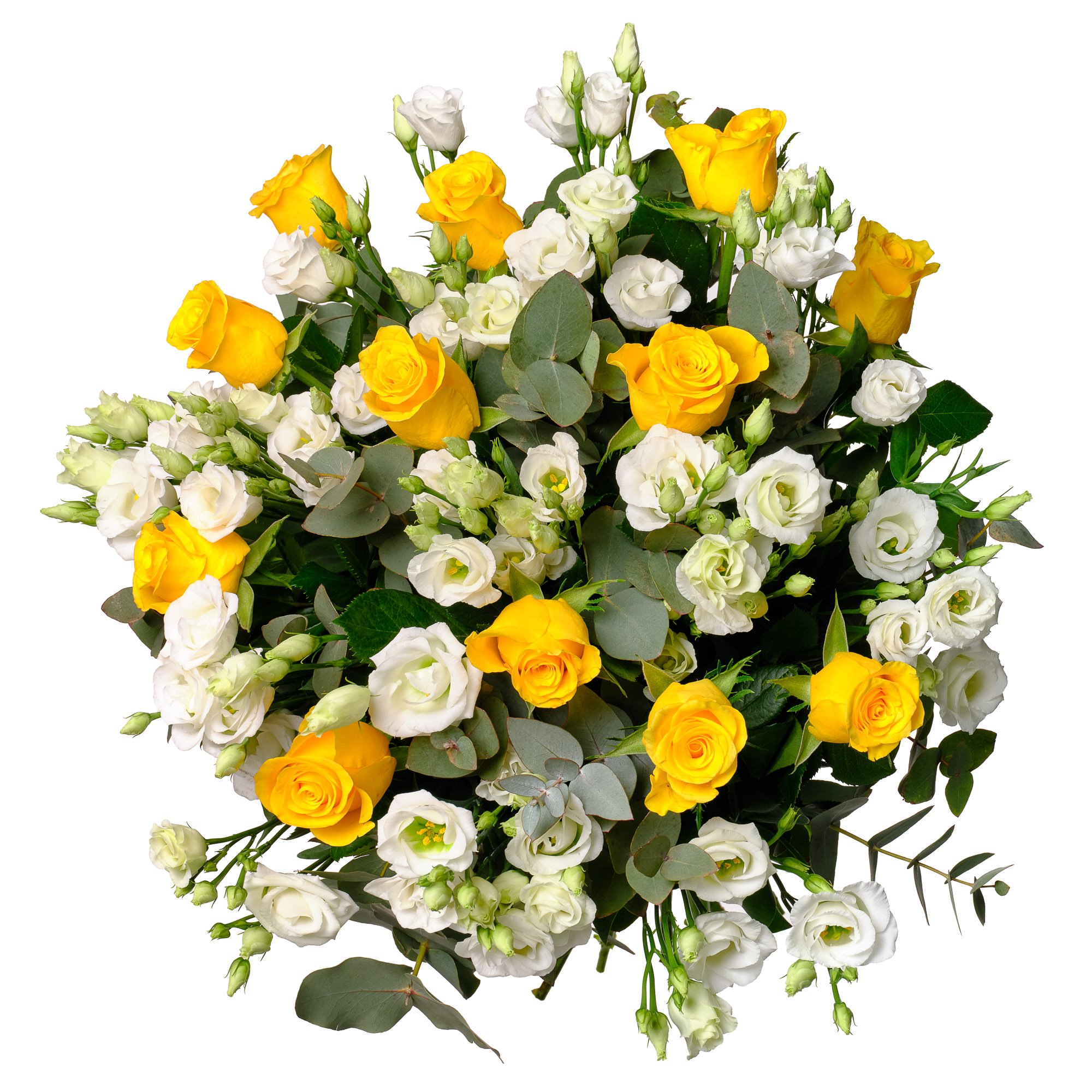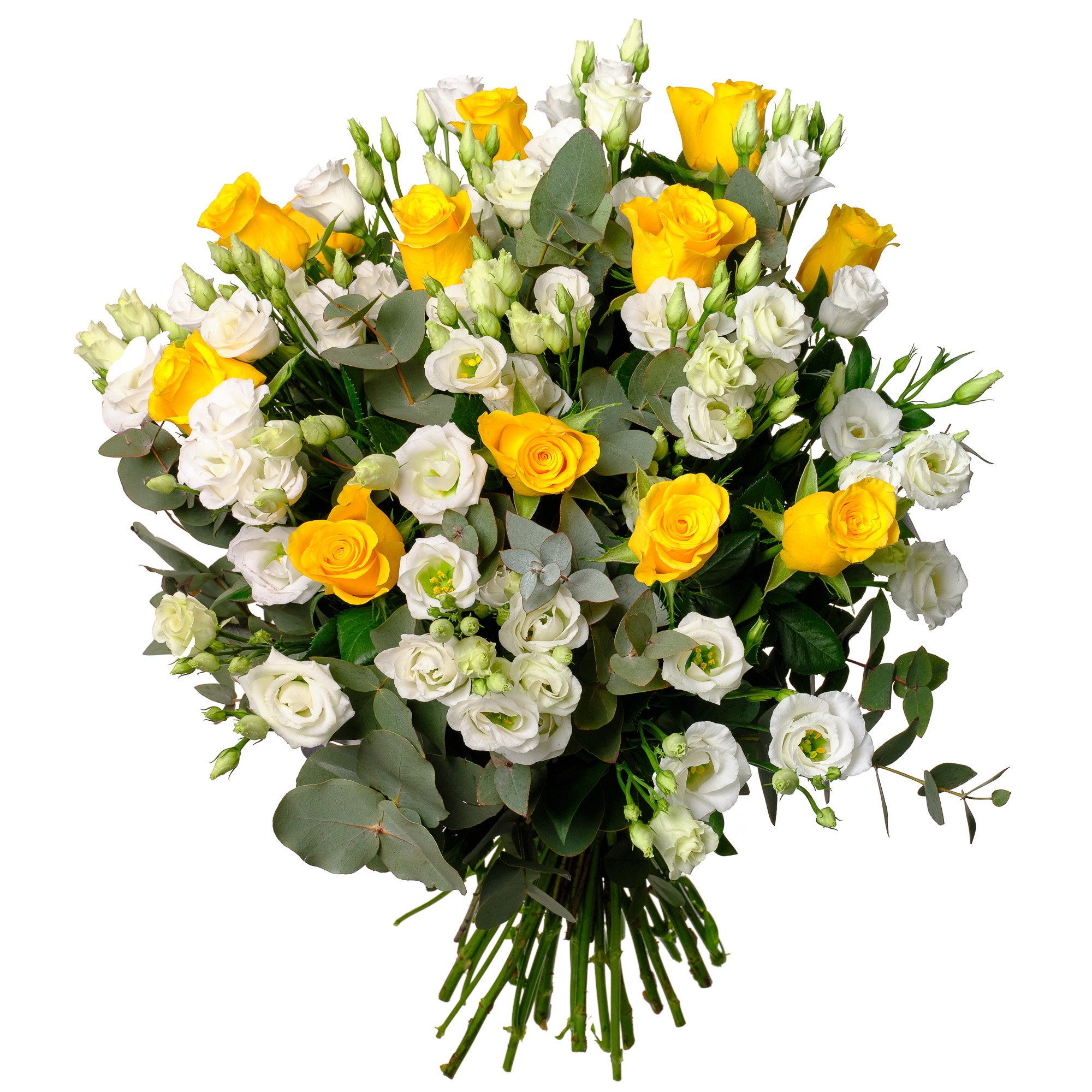 | Exkluzivní | 10 ks bílá eustoma, 11 ks žlutá růže a dekorativní zeleň (eukalyptus) |