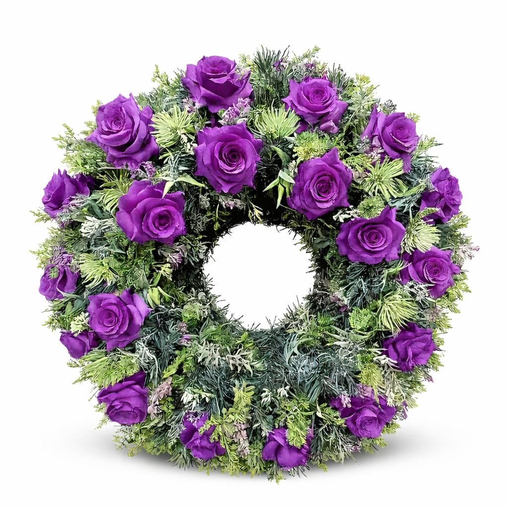 Hledáte spolehlivý rozvoz smutečních věnců ve Vsetíně a okolí? Tento trvanlivý smuteční věnec s fialovými růžemi nabízí důstojné a dlouhodobé řešení pietní výzdoby bez nutnosti další péče.