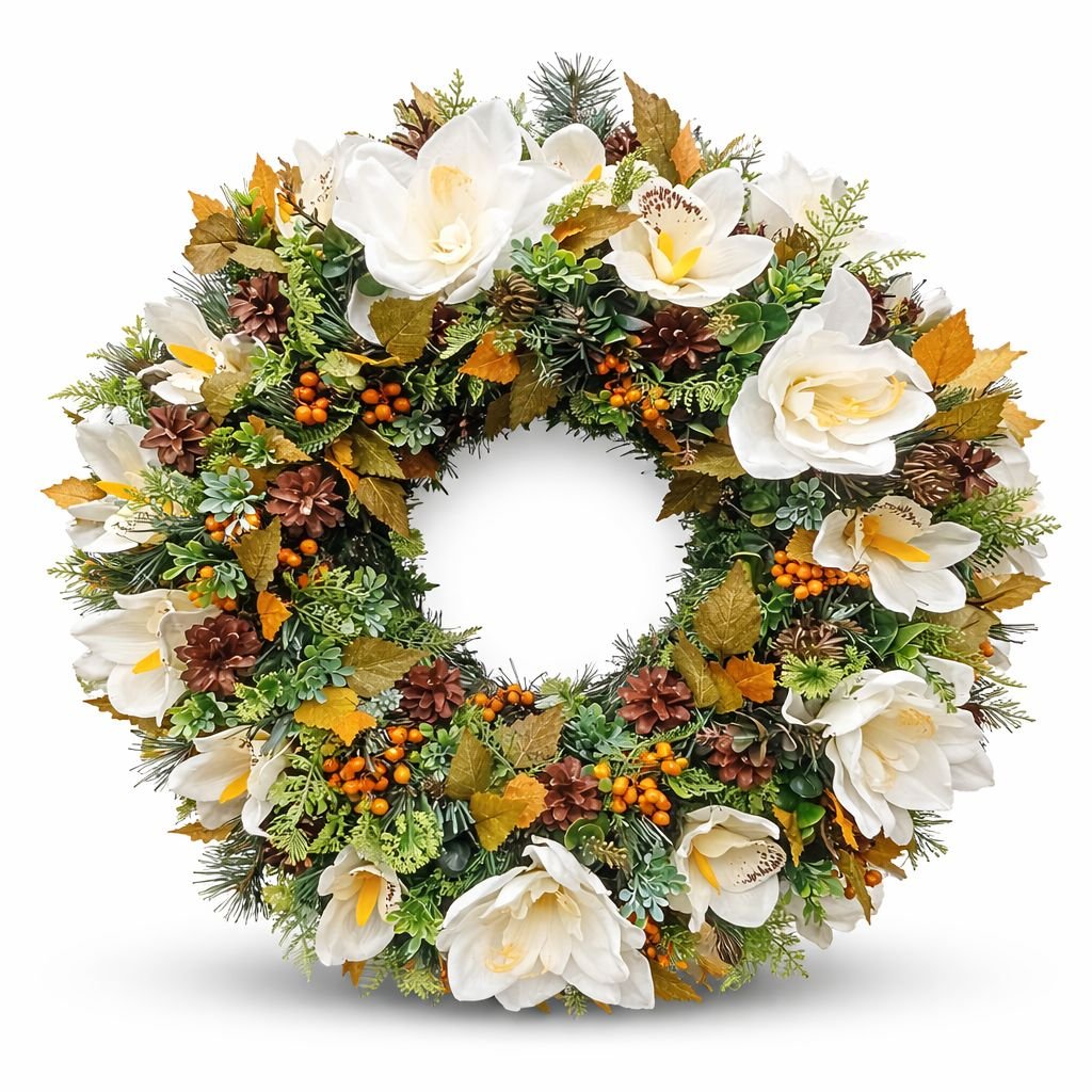 Tento trvanlivý smuteční věnec je laděn do jemných bílých tónů, které symbolizují klid, čistotu a důstojnou vzpomínku. Bílé květy jsou doplněny bohatou zelení, šiškami a dekorativními prvky v přírodních barvách.