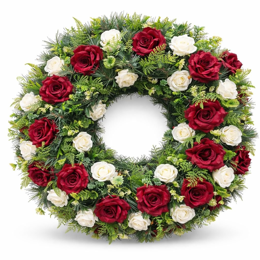 Tento smuteční věnec kombinuje výrazné červené růže s jemnými bílými květy a bohatou zelení. Barevná kombinace symbolizuje hlubokou úctu, lásku a tichou vzpomínku, čímž vytváří silný, ale zároveň důstojný vizuální dojem.